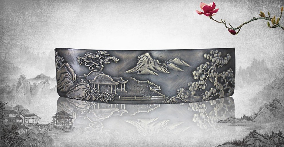 此幅青銅鑄造的《十八羅漢插屏》,是從一友人收藏的大約清中期紅木插屏上翻模制成的。整體上看玲瓏天成,布局精巧。從工藝上看雕法嫻熟,匠心獨具。特別是十八羅漢,個個活靈活現(xiàn)、栩栩如生。作者通過板塊錯落的布局,使畫面生動起來,產(chǎn)生了上乘的視覺效果。